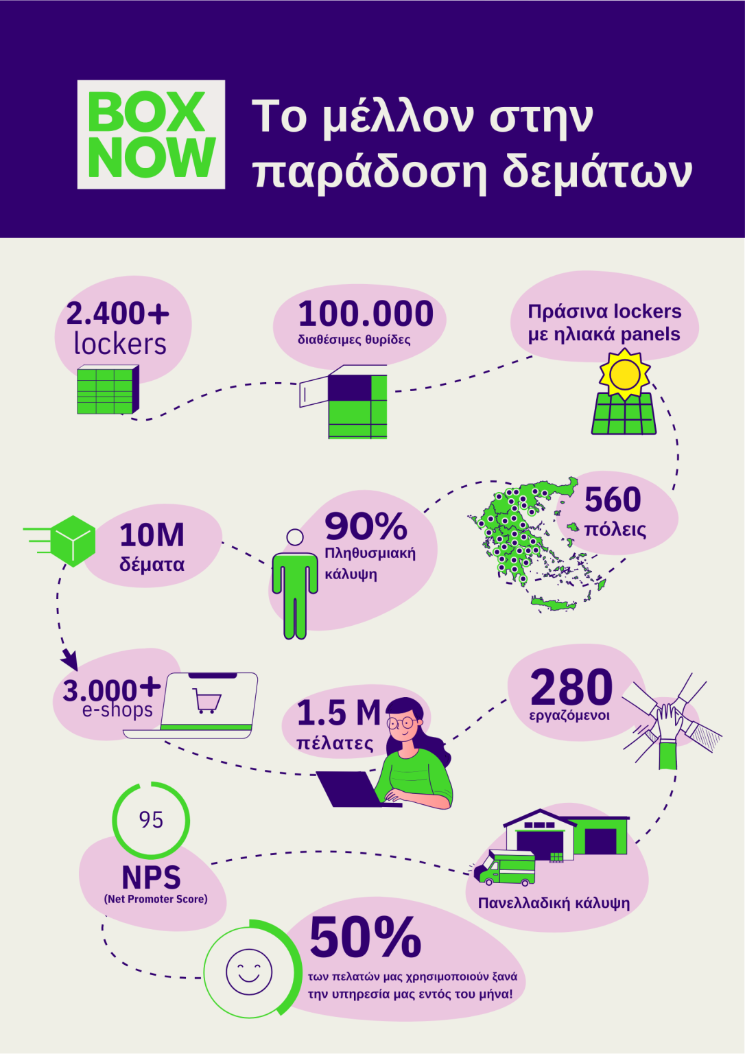 Η BOX NOW διαχειρίζεται ένα δίκτυο 2.400 Lockers υψηλής τεχνολογίας με περισσότερες από 120.000 θυρίδες σε 560+ πόλεις της Ελλάδας και Κύπρου, καλύπτοντας το 90% της επικράτειας.